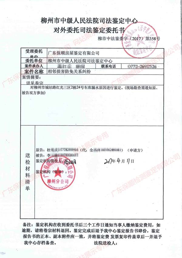 由柳州市中級人民法院審理的易**與柳州市康路建筑工程勞務有限責任公司、廣西建工集團第二安裝建設有限公司、廣西建工集團第二安裝建設有限公司第六分公司、鹿寨縣鹿和房地產開發有限公司、鄧**建設工程施工合同糾紛一案,因案情需要,受柳州市中級人民法院的委托,我司對建東小苑1#、2#、3#、5#地下室進行鑒定,鑒定事項為對建東小苑1#、2#、3#、5#樓地下室是否存在開裂、滲水現象及地下室剪力墻是否存在工程質量問題進行工程質量鑒定。