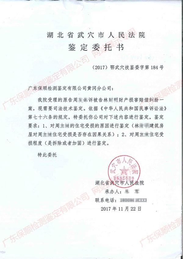 由湖北省武穴市人民法院審理的原告周**訴被告林**財(cái)產(chǎn)損害賠償糾紛一案,因案情需要,我司對(duì)林**建筑房屋與周**房屋受損是否存在因果關(guān)系和周**房屋受損程度(拆除或者加固)進(jìn)行相關(guān)房屋檢測(cè)鑒定。