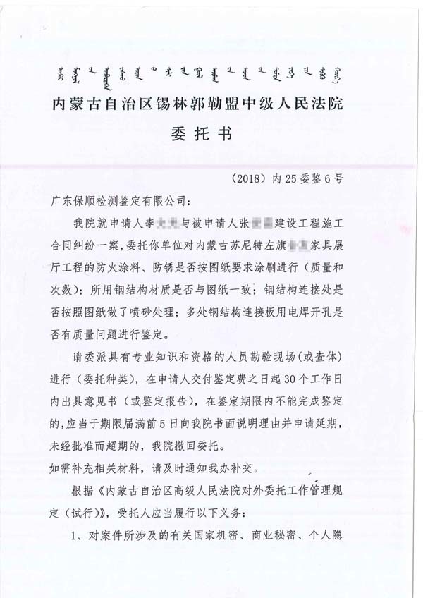 由錫林郭勒盟中級人民法院審理的(2017)內(nèi)2523民初519號一案,因案情需要,我司對涉案房屋鑒定區(qū)域防火涂料、防銹是否按照圖紙要求涂刷(只對是否涂刷及涂層厚度進行檢測);所用鋼結(jié)構(gòu)材質(zhì)是否與圖紙一致;鋼結(jié)構(gòu)連接處是否按照圖紙做了噴砂處理;多處鋼結(jié)構(gòu)連接板用電焊開孔是否有質(zhì)量問題進行鑒定。