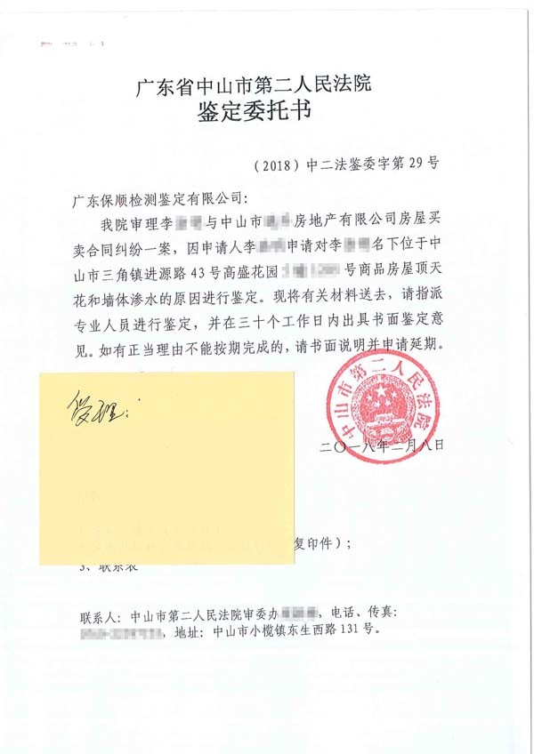 由廣東省中山市第二人民法院審理的原告李**與被告中山市**房地產(chǎn)有限公司房屋買賣合同糾紛一案,因案情需要,受廣東省中山市第二人民法院的委托,我司對李**房屋進(jìn)行鑒定,鑒定事項為中山市三角鎮(zhèn)進(jìn)源路43號高盛花園商品房屋頂天花和墻體滲水原因進(jìn)行鑒定。