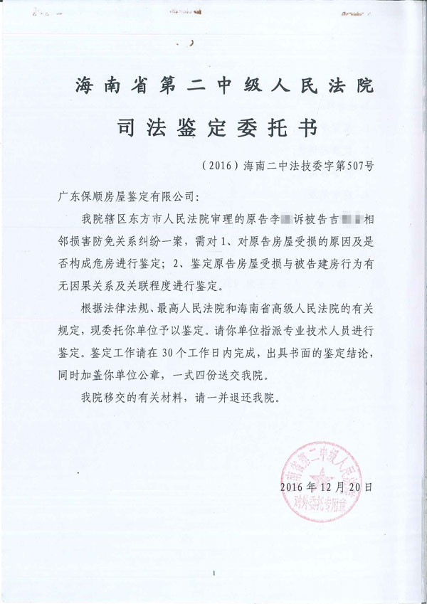 由海南省第二中級人民法院審理的原告李*與被告吉**相鄰損害責任關系糾紛一案,因案情需要,受海南省第二中級人民法院的委托,我司對李*房屋進行鑒定,鑒定事項為對原告房屋受損與被告建房行為是否存在因果關系及房屋安全等級進行鑒定。