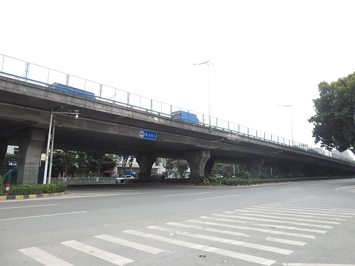 莞長路楊屋跨線橋(以下簡稱“該橋梁”)位于廣東省東莞市莞長路。橋梁全長370m,橋面總寬26m,橋面鋪裝為瀝青混凝土。上部結構為鋼筋混凝土連續箱梁,下部結構橋墩為鋼筋混凝土實體橋墩配樁基礎,橋臺為輕型式橋臺配樁基礎。橋梁概貌如照片1.1.1、1.1.2所示。